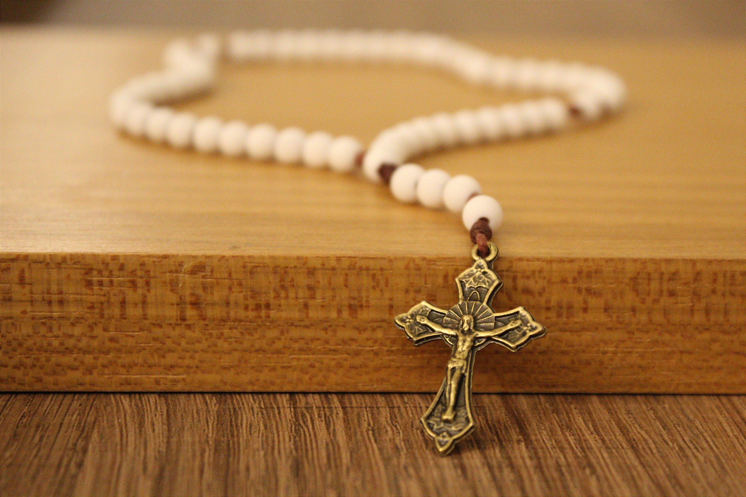 Terço artesanal feito à mão com corda 100% algodão e contas emborrachadas de 6 mm.